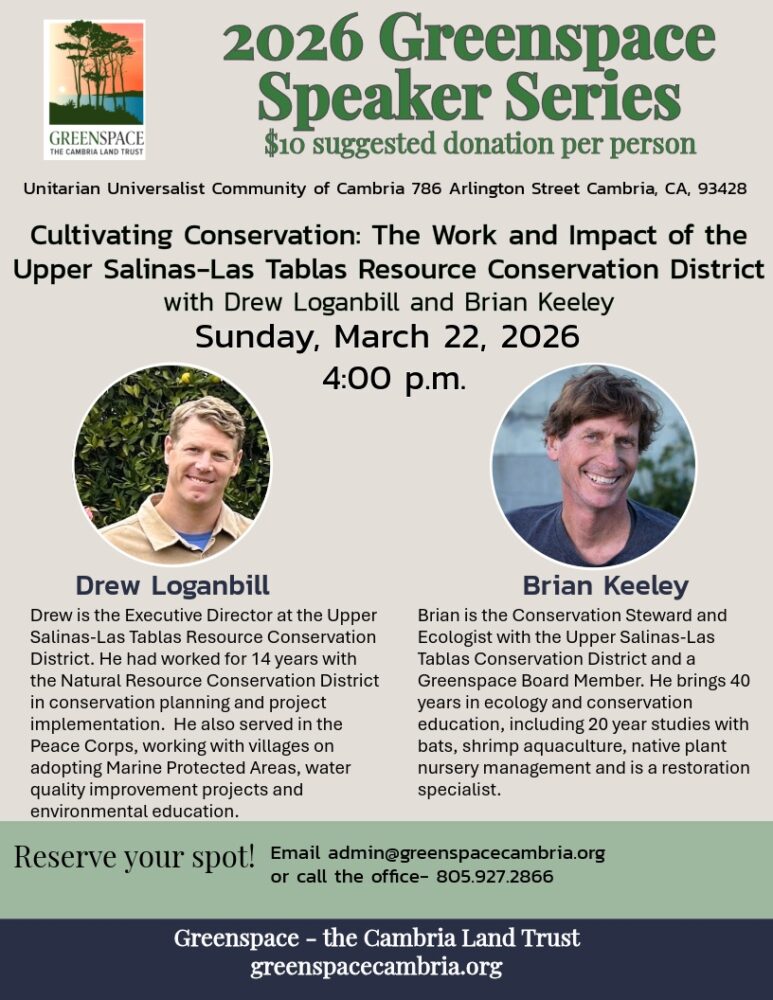 Join Greenspace for an inspired Speaker Series, titled The Work and Impact of the Upper Salinas-Las Tablas Resource Conservation District on Sunday, March 22, at 4 p.m., at the Unitarian Universalist Community of Cambria (786 Arlington). Drew Loganbill, Executive Director, and Brian Keeley, Conservation Steward and Ecologist, will speak about the work and impact of the local Resource Conservation District.